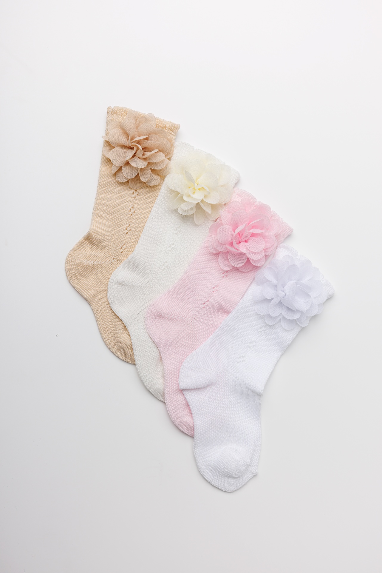 Meia fresca e pensada ao pormenor com o detalhe de uma flor primaveril aplicada a mão.