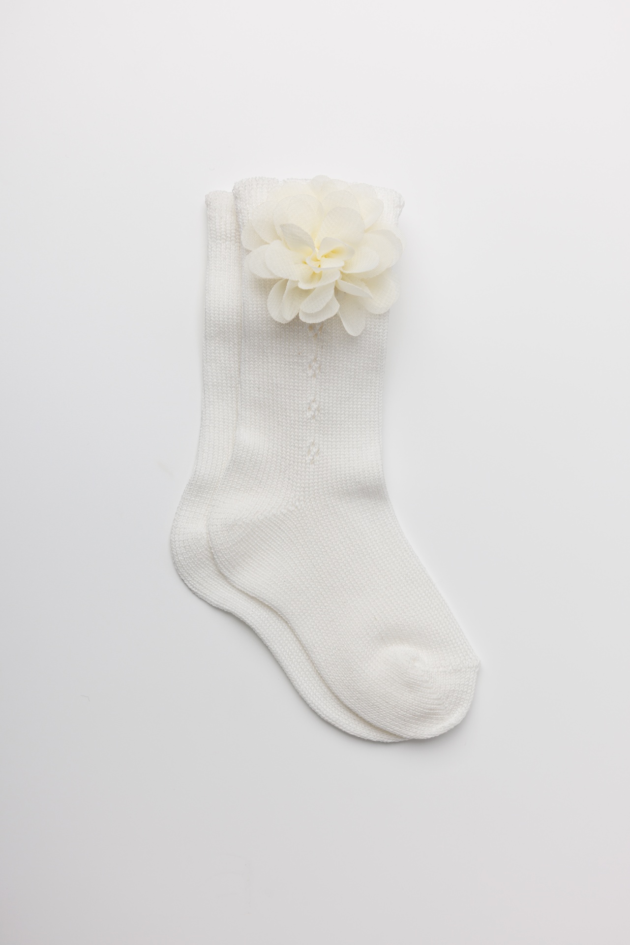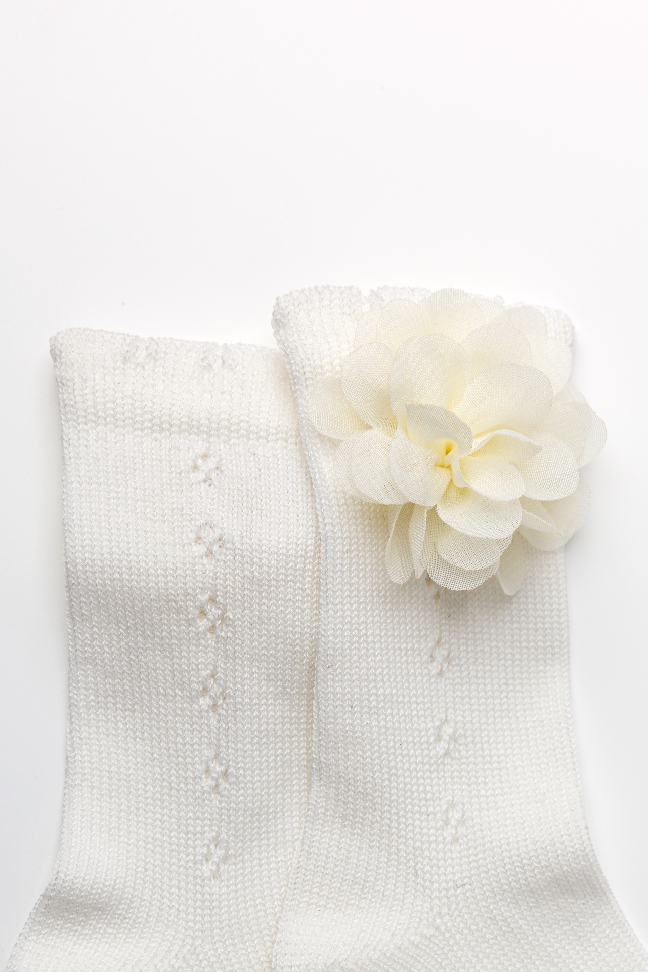 Meia fresca e pensada ao pormenor com o detalhe de uma flor primaveril aplicada à mão.