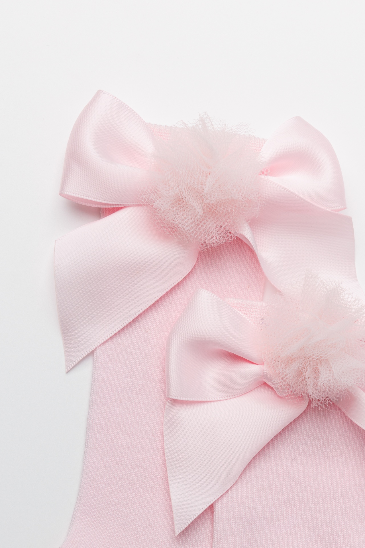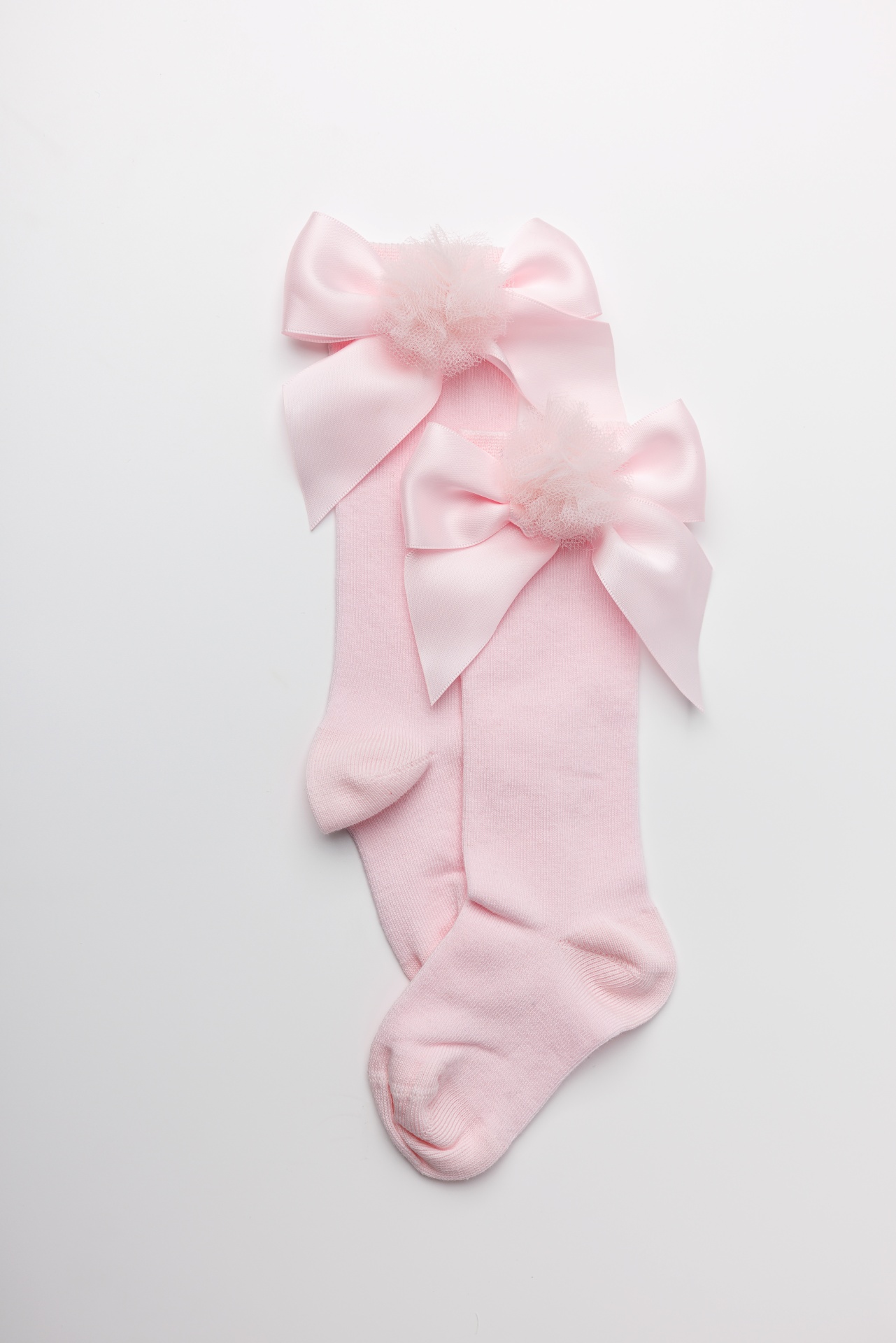 Meia até ao joelho lisa, com laço de cetim e finalizadas com um pompom em tule feito e aplicado à mão. Uma peça delicada que combina com qualquer ocasião.