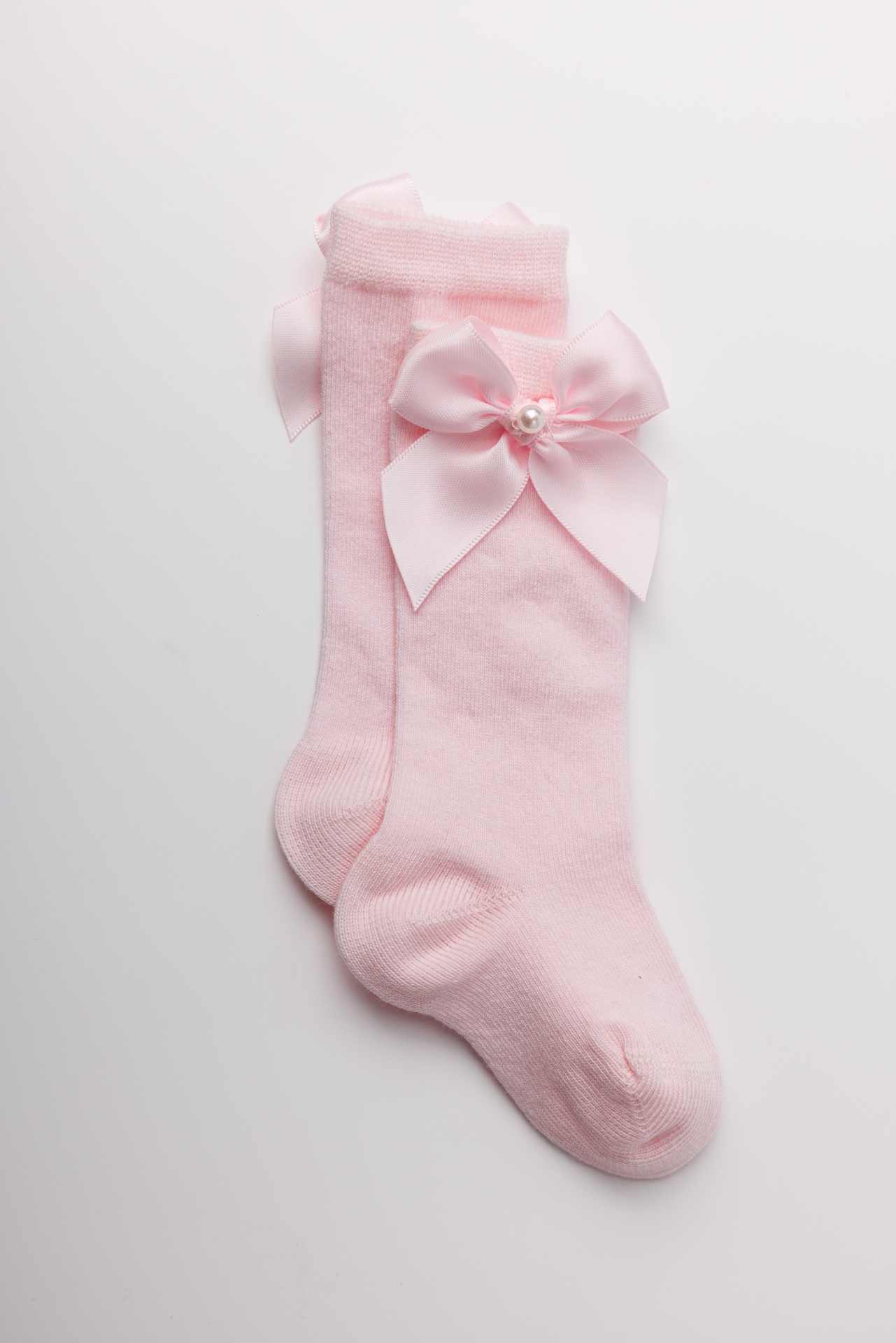Meia até ao joelho lisa, com laço de cetim e finalizadas com uma pérola aplicada a mão. Uma peça clássica que combina com qualquer ocasião.