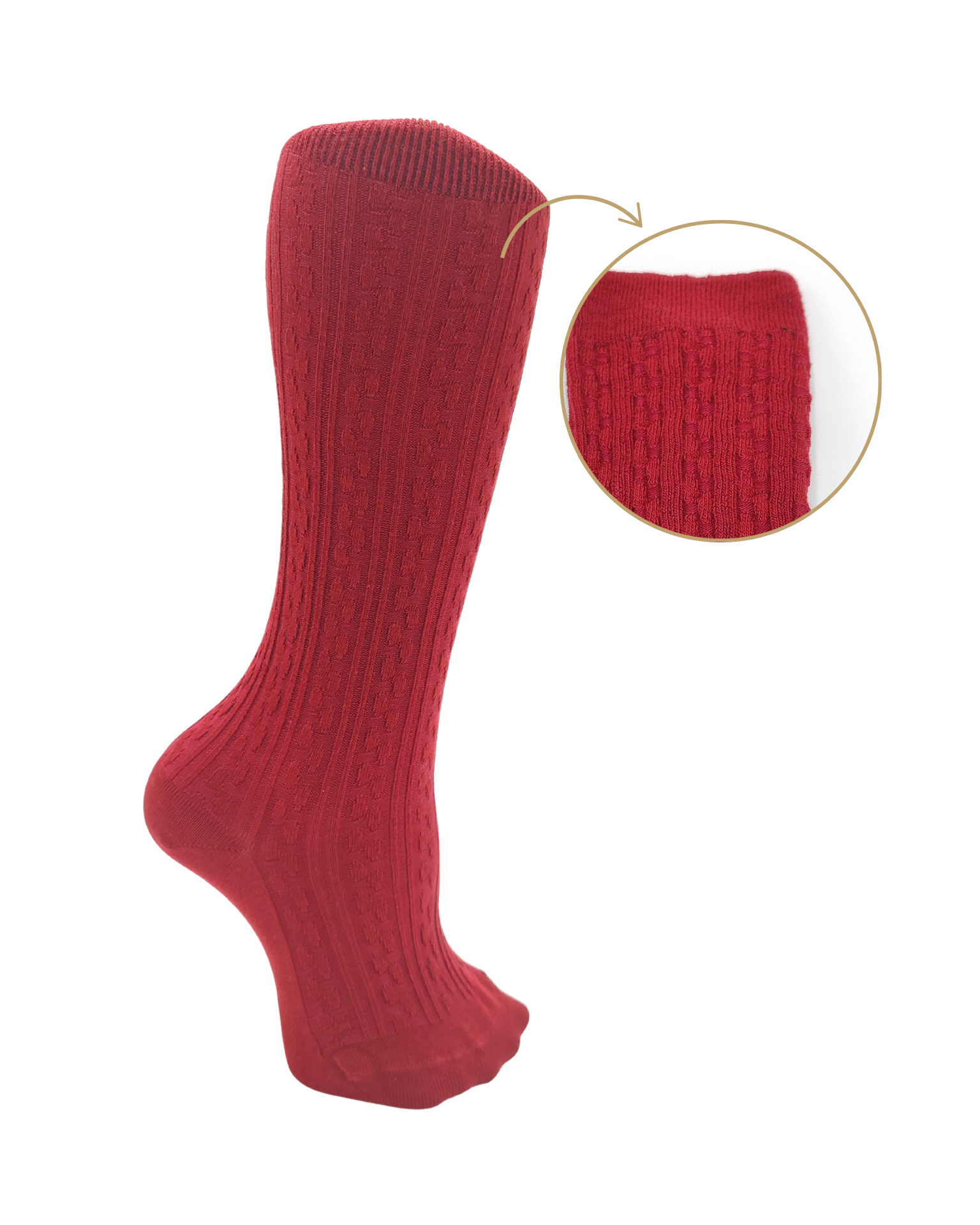 Meia até ao joelho desenvolvida em malha jacquard, com textura subtil e acabamento visualmente rico.
